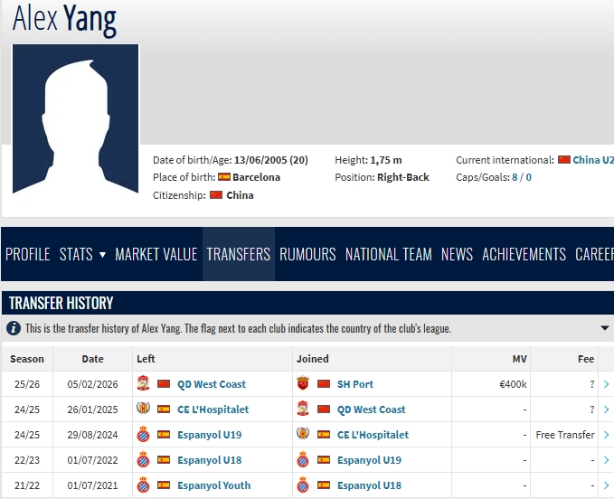 02月05日讯 据德转显示,20岁的右后卫杨希已经从青岛西海岸转会至上海海港。